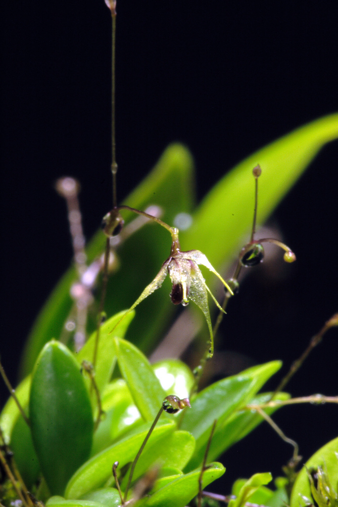 Found in Cuba, Haiti, Dominican Republic and Jamaica on twigs or rocks in mosses and lichens; prefers humid and partially open places like foggy mountain crests in elfin forests from 1000 to 1300 meters as a mini-miniature sized, cool growing epiphyte or lithophyte with very short ramicauls enveloped by 2 scarious, tubular sheaths and carrying a single, apical, coriaceous, green, glabrous, narrowly spathulate, acute to obtuse, tridentate, narrowly attenuate into the base leaf that blooms on a terminal, ascending, .4 to .75" [1 to 1.8 cm] long, 2 to 6 flowered inflorescence subtended by a sheath and arising through an annulus