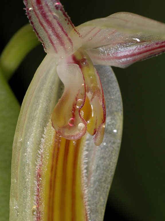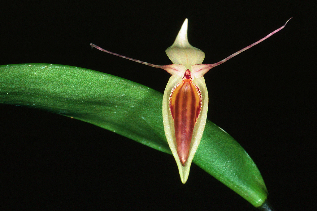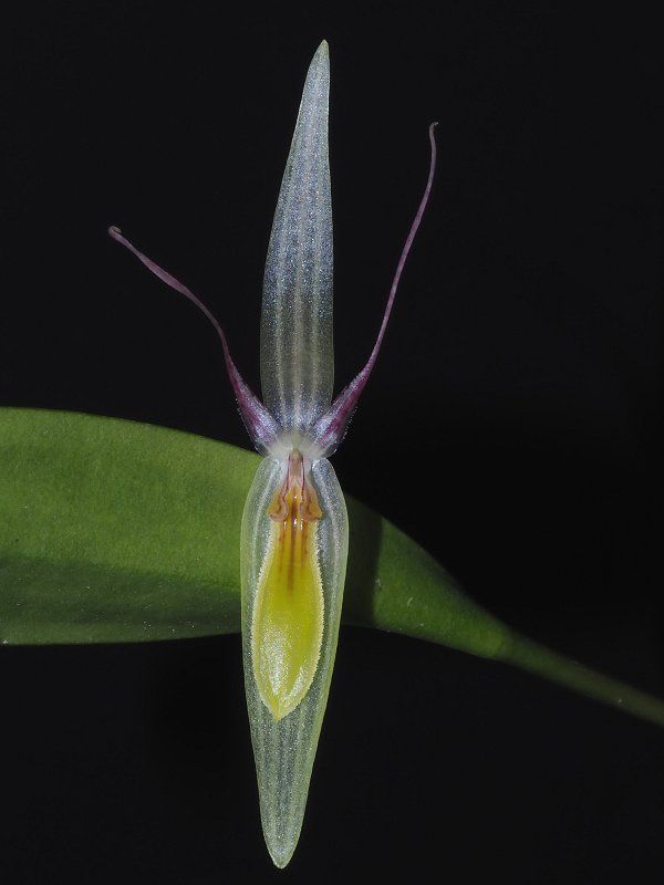 Found in wet montane forests of Colombia, Venezuela, Ecuador, Peru and Bolivia at elevations of 500 to 2100 meters as a warm to cold growing, caespitose epiphyte with green or dark purple ramicauls with 2 to 3 basal, tubular scarious sheaths and a single, apical, elliptic-lanceolate to narrowly oblong, minutely bilobed, narrowing below into the conduplicate petiolate base leaf that blooms in the spring, fall on an apical, short, fasciculate, few flowered inflorescence that holds the semi-pendulous, successively opening, nodding singular flower near the leaf base.