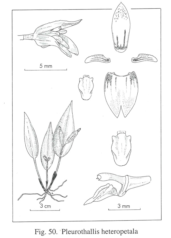 Pleurothallis heteropetala Luer 1976SUBGENUS Acianthera SECTION Brachystachyae Lindley 1859 Drawing by © Carl Luer and The Swiss Orchid Foundation at the Jany Renz Herbaria Website