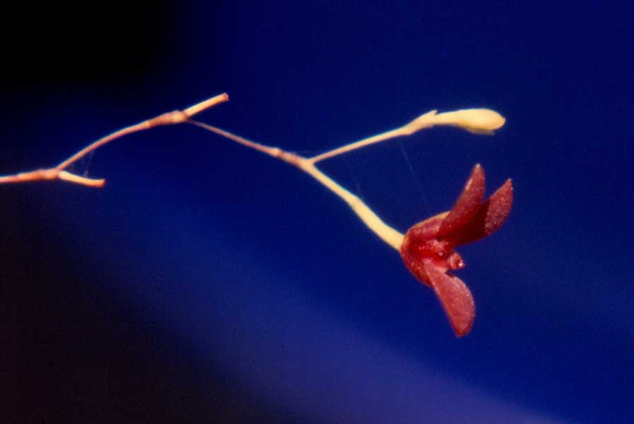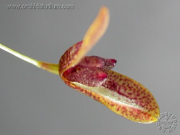 Found in southeastern Brazil at elevations around 1100 meters as a miniature sized, warm to cool growing epiphyte with erect, short, stiff ramicaul enveloped basally by 2 to 3 tubular sheaths and carrying a single, apical, erect, coriaceous, ovate-lanceolate, acute, deep shiny green, distinctly keeled, gradually narrowing below into the petiolate base leaf that blooms in the late fall and early winter and again in the late spring and early summer on a fine, 3.6" [9 cm] long, racemose to 8 flowered inflorescence arsiing from the apex of the ramicaul with successively opening flowers