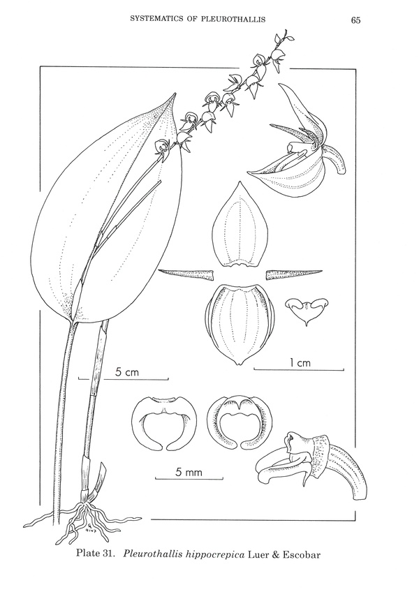 References W3 Tropicos, Kew Monocot list , IPNI ; Icones Pleurothallidinarum Systematics of Pleurothallis Vol 3 Luer 1986 drawing fide; Icones Pleurothallidinarum Vol XVIII Systematics of Pleurothallis subsection Antenniferae, Longiracemosae, Macrophyllae-racemosae and Subgenera Pseudsostelis and Acuminata Luer 1999 drawing fide;