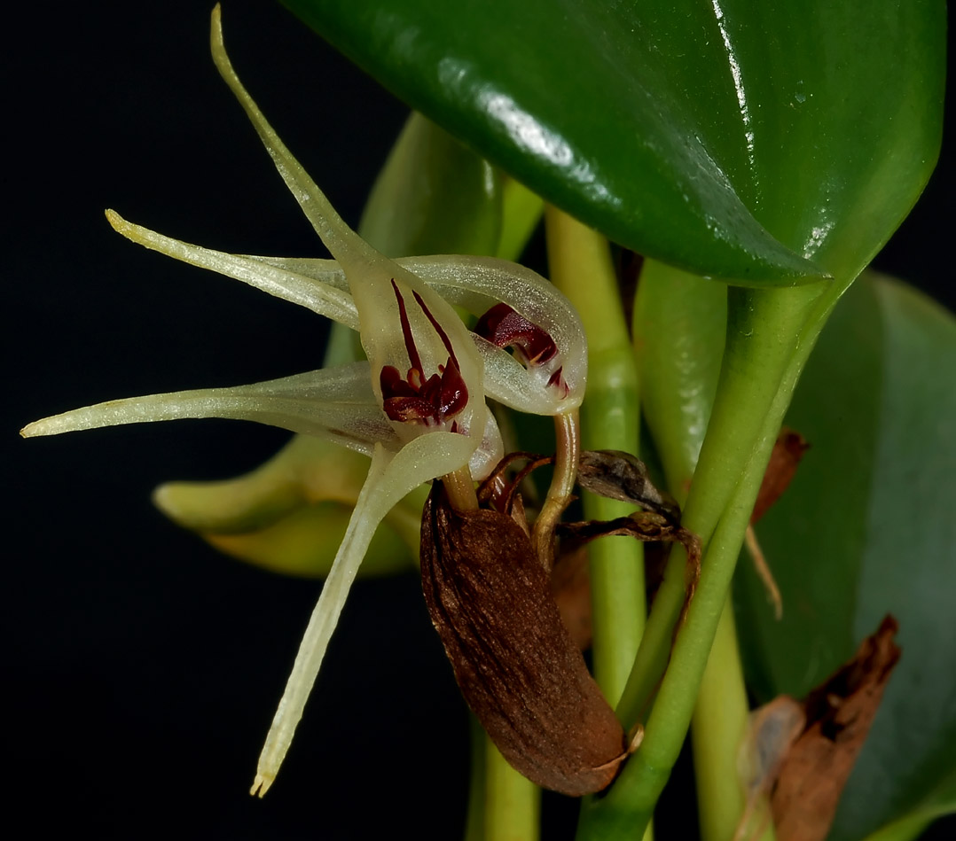 Found in Colombia, Venezuela, Guyana, Ecuador, Peru and Brazil in dense forests at elevations of 300 to 2900 meters as a small sized, hot to cold growing epiphyte with an erect, slender ramicaul partially enveloped below by 2 to 3 tubular sheaths and another below the middle and carrying a single, apical, erect, coriaceous, elliptical, acute, cuneate below into the twisted petiolate base leaf that blooms in the fall and winter on a single, successively few flowered fascile arising through a spathe from near the apex of the ramicaul and carrying thin, tubular floral bracts.