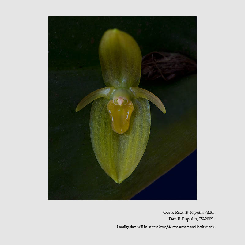Found in El Salvador, Honduras, Nicaragua, Costa Rica, Panama and Brazil at elevations of 1150 to 1900 meters as a small sized, cool growing epiphyte with slender, erect ramicauls enveloped by a tubular sheath below the middle and 2 others at the base and carrying a single, apical, horizontal, coriaceous, ovate, acute, sessile and cordate base leaf that blooms in the winter on a successively single flowered inflorescence with the peduncle concealed by the reclining spathe and has tubular floral bracts.
