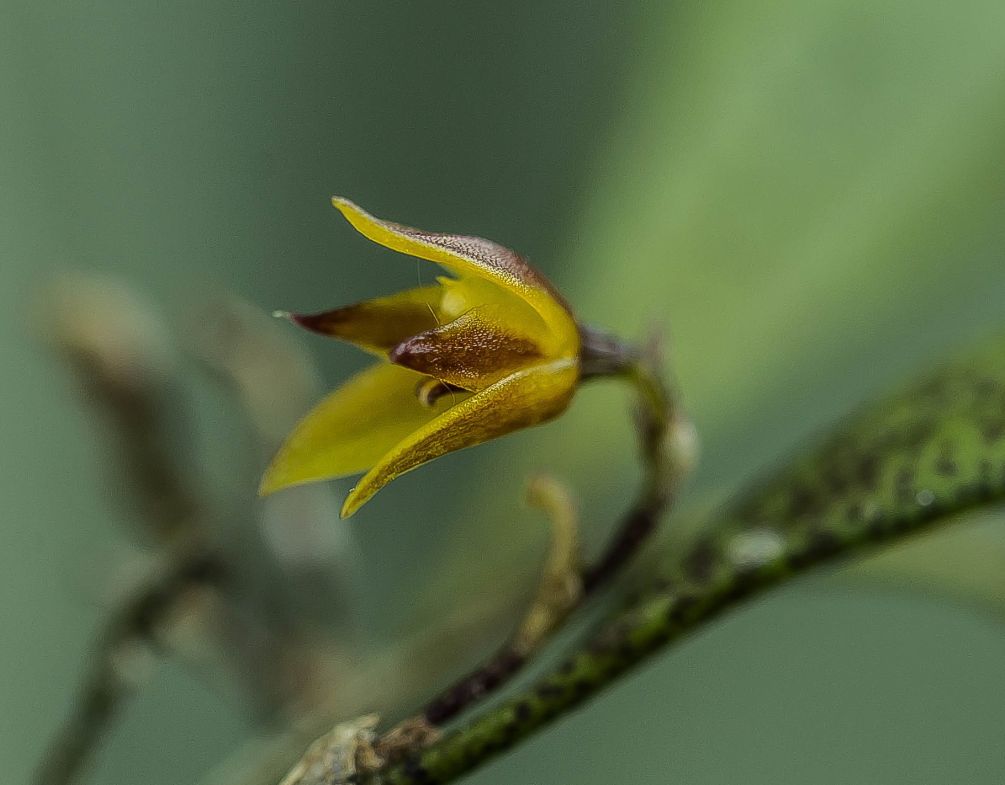 Found in Venezuela at elevations of 1000 to 1200 meters as a mini-miniature sized warm to cool growing epiphyte with erect, stout ramicauls with a tubular sheath below the middle and 1 to 2 others at the base carrying a single, apical, erect, coriaceous, elliptical, subacute, cuneate below into the petiolate base leaf that blooms in the late summer and fall on a 1.6 to 2" [4 to 5 cm] including the .8 to 1" [2 to 2.5 cm] long peduncle, that is slightly longer than the leaf, successively and distantly 2 to 3 flowered inflorescence arising from a node below the abscission layer and has a thin tubular, microscopically scabrous floral bract.