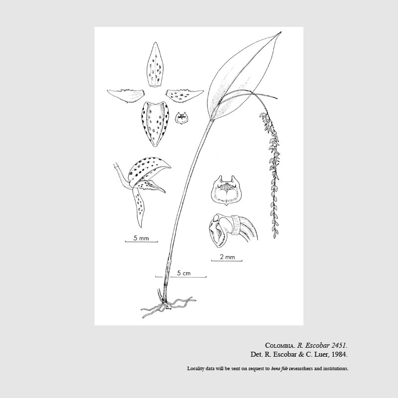 References W3 Tropicos, Kew Monocot list , IPNI ; *Orquideología 16(2): 167. Luer & Escobar 1984 drawing fide; Native Colombian Orchids Vol 3 COS 1991 photo fide; Icones Pleurothallidinarum Vol III Luer 1986; Icones Pleurothallidinarum Vol XVIII Systematics of Pleurothallis subsection Antenniferae, Longiracemosae, Macrophyllae-Racemosae and Subgenera Pseudsostelis and Acuminata Luer 1999 drawing fide;