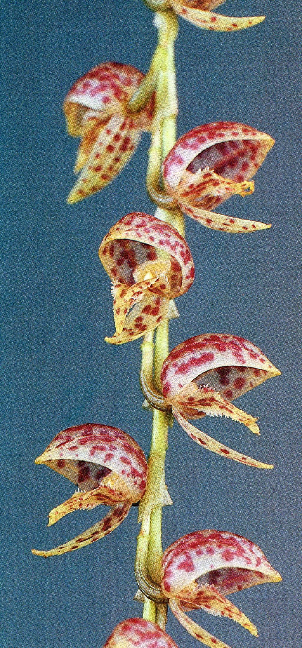 "Distinguished by the long, arching raceme of small spotted flowers. The uppermost synsepal is deeply concave, the ,margins of the petals are shortly and irregularily fimbriate and the broadly ovate lip has a pair of small, conical calli near the deflexed base." Luer 1999