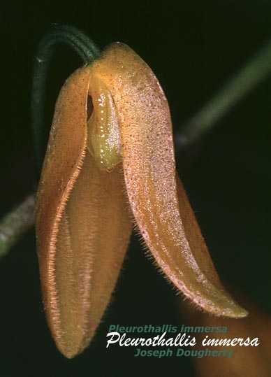 References W3 Tropicos, Kew Monocot list , IPNI ; Lankester's Epidendra Website CR ; *Bonplandia 3: 224. Rchb.f 1855; Xenia Orchidaceae Vol 3 Reichenbach 1896 drawing; Die Orchideen Schlechter 1915; Repert. Sp. Nov. Regni. Veg. Beih. 19: 184. Costa Rica Schlechter 1923 as P calerae; Orchids of Guatemala and Belize Ames & Correll 1952; Orchids of Guatemala & Belize Ames & Correll 1952; Venezuelan Orchids Vol 3 Dunsterville & Garay 1965 drawing good; Encyclopedia of Cultivated Orchids Hawkes 1965; Flora de Venezuela Foldats Volumen XV Part 2 1970 drawing ok; Orchids of Venezuela, An Illustrated Field Guide Vol 3 Dunsterville & Garay 1979 drawing good; AOS Bulletin Vol 49 No 6 1980 photo fide; Icones Planetarum Tropicarum plate 1112 Dodson 1984 drawing fide; Icones Pleurothallidinarum Systematics of Pleurothallis Vol 3 Luer 1986; Orchids Travel By Air A Pictoral Safari Mulder, Mulder-Roelfsema and Schuiteman 1990 photo fide; Native Colombian Orchids Vol 3 COS 1991 as P immersa photo not = P lehmanneptis; Venezuela; Paraiso de Orquideas Romero 1997 photo fide; Native Colombian Orchids Vol 6 COS 1998 errata = P lehmanneptis; Guatemala Y Sus Orquideas Behar & Tinschert 1998 photo fide; Native Colombian Orchids Vol 6 COS 1998 photo ok; Orchids of Venezuela [An illustrated field guide] Vol. 3 Ramiro and Carnevali 2000 drawing fide; Icones Pleurothallidinarum Vol XX Luer 2000 drawing fide; Lindleyana Vol 16 No 4 2001 as Stelis immersa; Manual de Plantas de Costa Rica Vol 3 Hammel, Grayum, Herrera and Zamora 2003; Icones Pleurothallidinarum Vol XXVI Luer 2004 as Specklinia immersa; Orchids of Mexico Hagsater etal 2005 as Stelis immersa photo good; Icones Pleurothallidinarum Vol XXIX Luer 2007 as Effusiella immersa; Icones Orchidacearum fascile 10 plate 1096 Hagsater & Soto 2008 as Stelis immersa drawing fide; Orchids of Costa Rica Vol 5 Morales 2009 photo fide; Algunas Orquideas De Mexico Suarez 2012 photo fide; Guia de Orquideas de Chiapas Carlos Rommel Beutelspacher Baigts 2013 as Stelis immersa photo fide; Diversity of Pleurothallidinae in Guatemala: An Endangered Orchid Subtribe with High Economic and Horticultural Potentials Edgar Mo Mo, Cetzal, Basu and Vega 2017 as Stelis immersa photo fide; Lankesteriana 19(1). 31 - 55 2019 as Stelis immersa photo fide