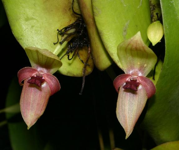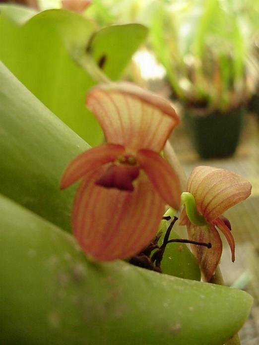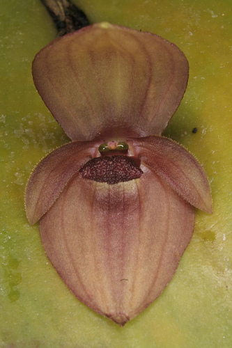This is a small sized, Ecuadorian and Colombian, cool to cold growing epiphytic or terrestrial species found on steep embankments at an altitude of 1000-2500 meters in very wet montane cloud forests with an elongate, stem enveloped basally by 2 to 3 tubular sheaths and carrying a single, apical, cordate leaf and blooms in the winter and spring on an apical, short to 1" [2.5 cm], fasciculate, successively single flowered inflorescence arising from a spathe, that holds the flower close to the leaf base.