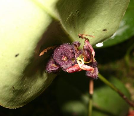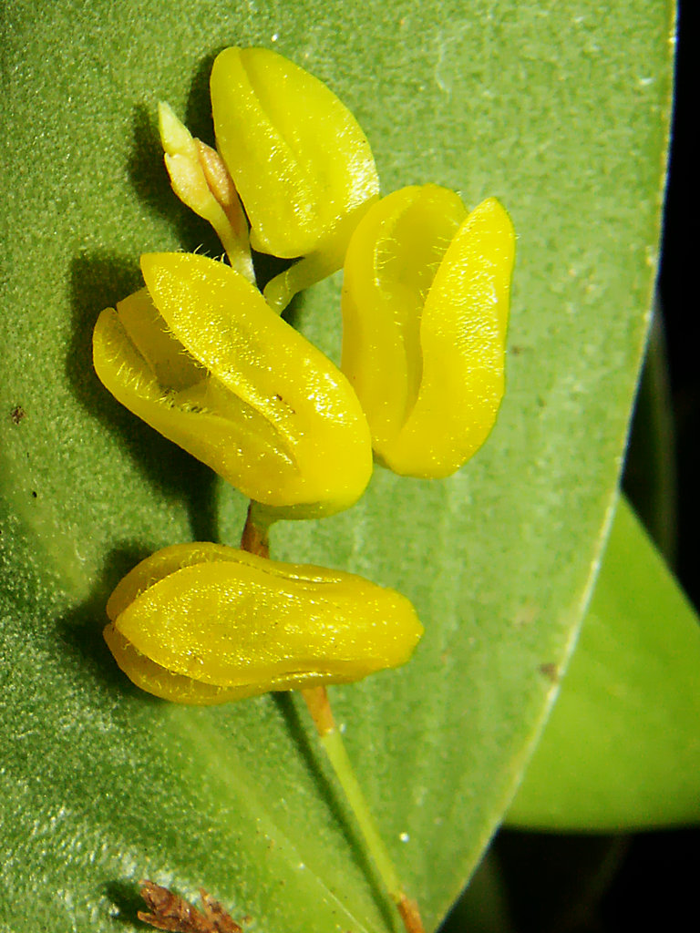Found in The Leeward and Windward Islands, Guyana, Surinam, Costa Rica, Panama, Venezuela, Colombia, Ecuador, Peru, and Brazil in cloud forests as a small sized, warm to cool growing, caespitose epiphyte or terrestrial on steep embankments that occurs at elevations of 600 to 1300 meters with elongate ramicauls subtended by a scarious, semi-inflated basal bract and then another below the middle carrying a single, apical, ovate, gradually rounds out to a long petiolate base, acute leaf and blooms in the winter and spring on several lateral, 3" [7.5 cm] long, laxly racemose inflorescence arising from a spathe and usually held on the back side of the leaf with several distant, tubular, appressed bracts and successively opening, 7 to 15, pubescent flowers held at mid leaf height.