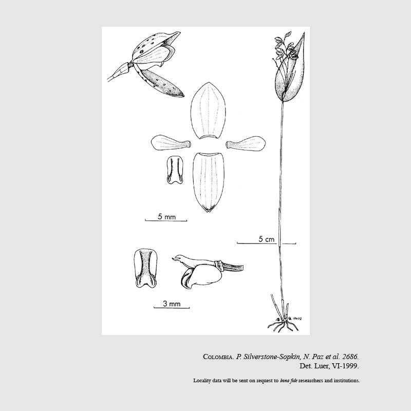 Found in Valle de Causa Colombia at elevations around 2400 meters as a small sized, cold growing epiphyte with slender, erect ramicauls enveloped by a thin, tubular sheath below the middle and 2 to 3 others at the base and carrying a single, apical, erect, coriaceous, ovate, acute, slightly acuminate, long-mucronate, broadly cuneate to rounded below into the sessile base leaf that blooms in the late fall and early winter on 1 to a few, erect, lax, 1.6 to 2" [4 to 5 cm] long includin the .8 to 1.2" [2 to 3 cm] long peduncle, simultaneously few flowered inflorescence arising through a slender spathe at the base of the leaf and has a infundibular floral bract.