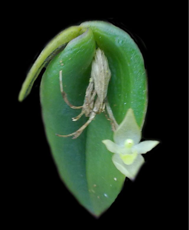 Found in Valle de Cauca department of Colombia on the eastern side of the Cordillera Occidental in cloud forests at elevations of 1850 to 1900 meters as a small sized, cool growing epiphyte with erect, thin, 4 angled ramicauls enveloped by tubular, papyraceous bracts and carrying a single, apical, suberect, coriaceous, ovate, acute, sessile base leaf that blooms in the late summer and early fall on a subfascile of single flowered peduncles.
