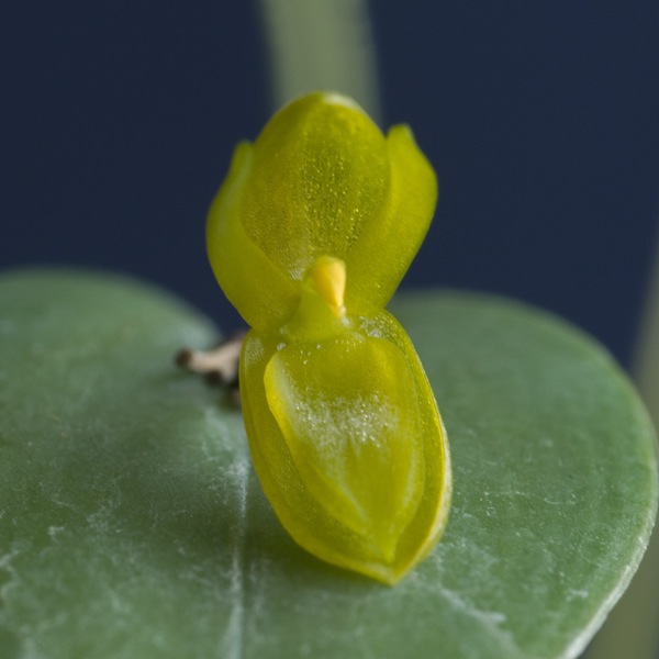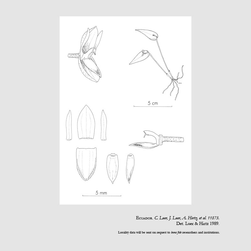Found in Morona-Santiago province of Ecuador in cloud forests at elevations around 1700 to 1800 meters as a mini-miniature sized, cool growing epiphyte with slender, erect, sharply ancipitous ramicauls with 2 to 3 tubular sheaths near or at the base and carrying a single, apical, more or less spreading, coriaceous, ovate, acute, rounded to shallowly cordate into the sessile base leaf that blooms in the summer on a fascile of .2 to .24" [5 to 6 mm] long, successive single, few flowered inflorescence arising from the base of the leaf through a reclining spathe
