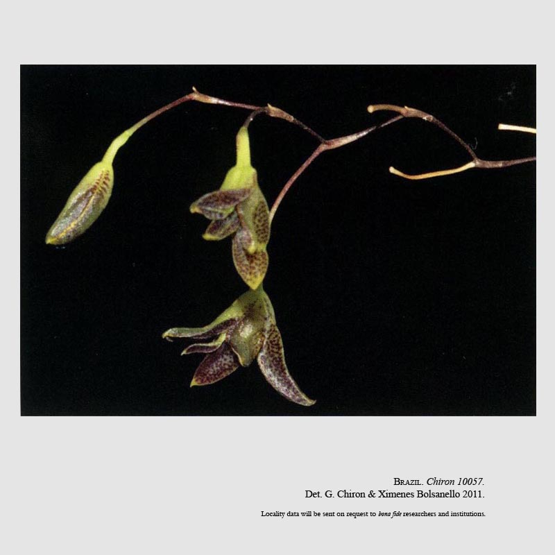 Found in Parana' Brazil at elevations below 800 meters as a miniature sized, hot to warm growing epiphyte with erect, very short, cylindrical ramicauls enveloped by a tubular sheath and carrying a single, apical, erect, coriaceous, lanceolate, rounded apically, cuneate below into the petiolate base leaf that blooms in the late summer and early fall on an erect, filiform, strongly fractiflex, .8 to 2" [2 to 2.5 cm] long, successively 2, few flowered inflorescence arising through a spathe at the apex of the ramicaul