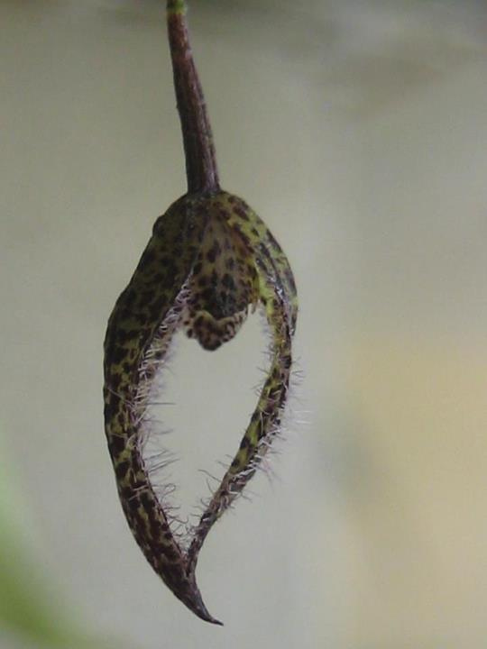 Found in Chiapas Mexico and Guatemala at elevations of 1500 to 2300 meters as a small sized, warm to cold growing epiphyte with slender, terete, erect ramicauls enveloped by 2 to 3, thin, tubular sheaths and carrying a single, apical, erect, coriaceous, elliptical, subacute to obtuse, cuneate below into the petiolate base leaf that blooms in the fall, spring and summer on an erect, 3.2 to 6.8" [8 to 17 cm] long peduncle and 5.6" to 12" [14 to 30 cm] long overall, loose, secund, simultaneously many flowered inflorescence subtended by a spathe arising from near the apex of the ramicual and has oblique, acute floral bracts.
