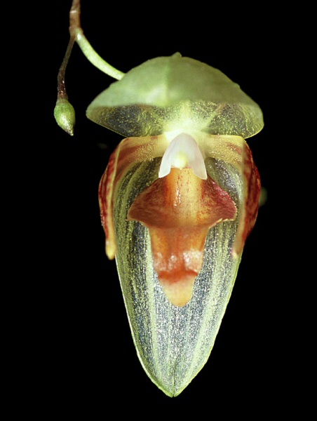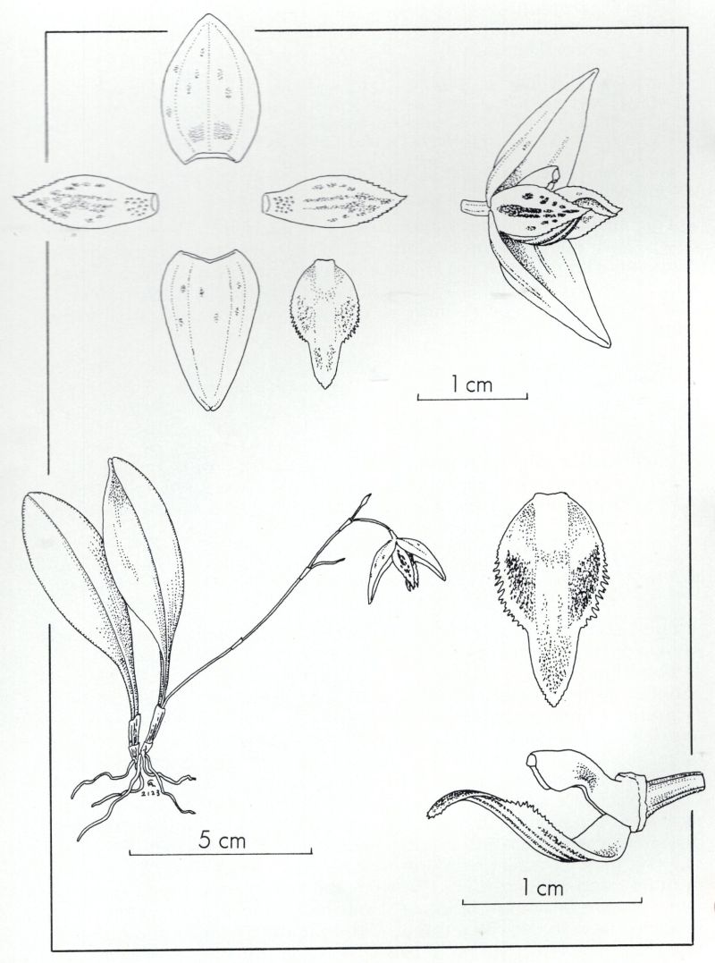 Found in Costa Rica at elevations of 500 to 1000 meters as a small sized, warm growing epiphyte with erect ramicauls enveloped basally by 2 to 3 tubular sheaths and carrying a single, apical, erect, elliptic, obtuse, gradually narrows below into the elongate petiolate base leaf that blooms in the summer and fall on an erect to lateral, 2.4" [6 cm] long, succesively single flowered inflorescence arising from above the base .