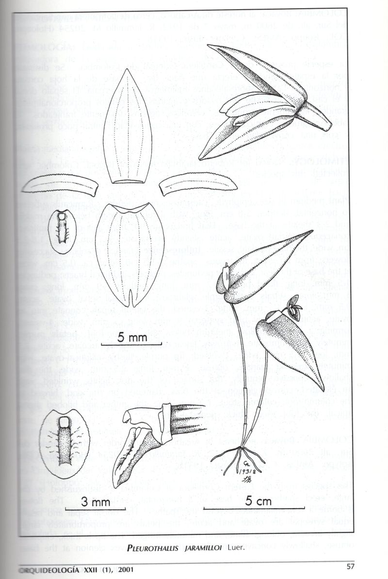 References W3 Tropicos, Kew Monocot list , IPNI ; *Orquideología Vol 22 #1 pg 53-56. Luer 2001 drawing fide, Icones Pleurothallidinarum Vol XXVII Luer 2005 as Acronia jaramilloi drawing fide;