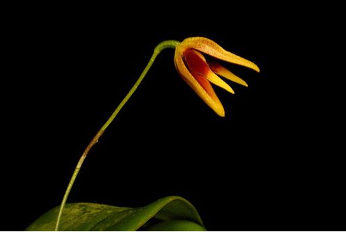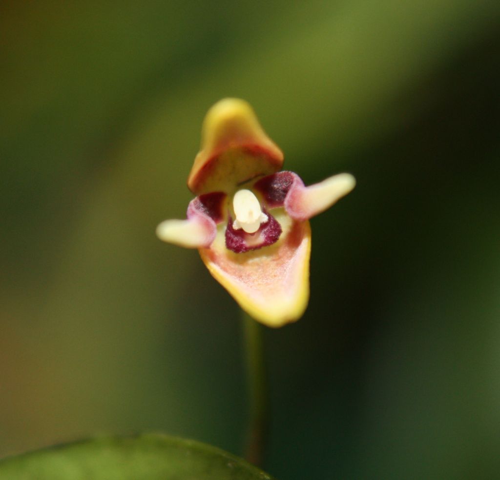 Found in Valle de Cauca department of Colombia on the eastern side of the Cordillera Occidental in cloud forests at elevations of 1400 to 1600 meters as a medium sized, cool growing epiphyte with slender, erect, sharply ancipitous above the middle ramicauls enveloped by a tubular sheath above the base and 2 to 3 others at the base and carrying a single, apical, erect, coricaeous, rigid, elliptical-ovate, acute, carinate externally, cuneate into the conduplicate and decurrent onto the ramicaul, sessile base leaf that blooms in the late spring through summer on a fascile of slender, erect, .4" [1 cm] long, successively single flowered inflorescence arising through a reclining spathe above the base of the leaf.