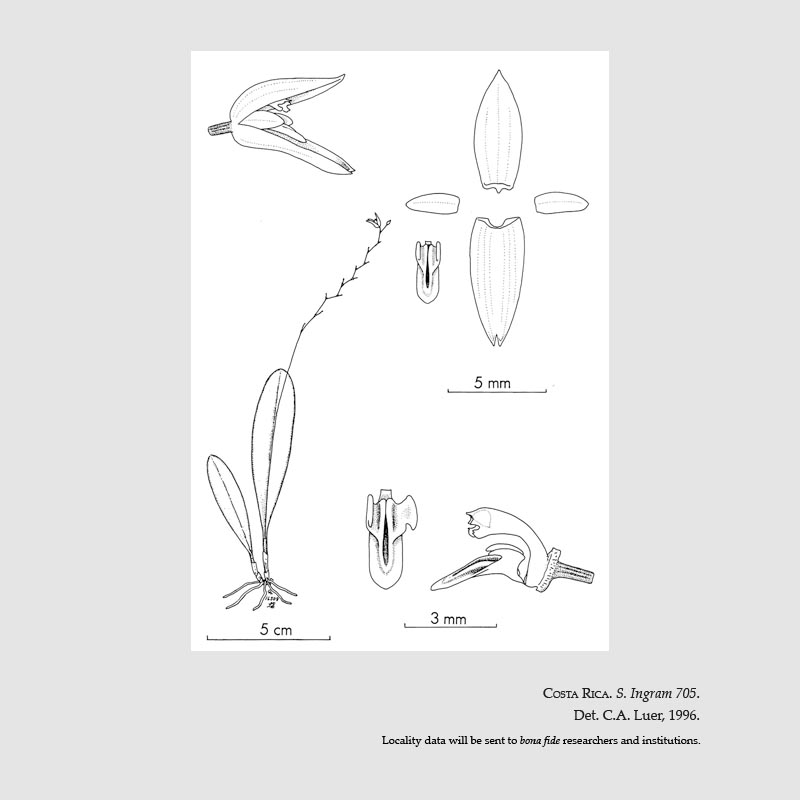 Found in Limon province of Costa Rica an the eastern coast at elevations around 700 to 780 meters as a mini-miniature sized, warm growing epiphyte with slender, erect ramicauls enveloped by 2 to 3 thin, tubular sheaths and carrying a single, apical, erect, coriaceous, obovate, obtuse to rounded, cuneate below into the conduplicate base leaf that blooms in the fall on a loose, distichous, flexuous, to 6" [to 15 cm] long including the 3.2 to 4" [8 to l0 cm] long peduncle, successively single several flowered inflorescence arising through a slender spathe from the apex of the ramicaul with oblique acute floral bracts .