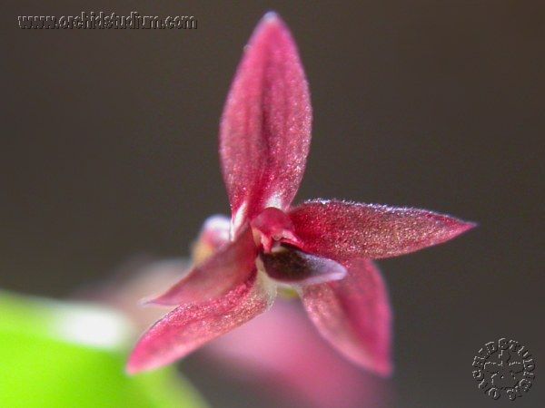 Found in Espirito Santo Brazil as a mini-miniature sized, warm to cool growing epiphyte with filiform, cylindric ramicauls enveloped by 3, solitary sheaths and carrying a single, apical, elliptic-lanceolate, minutely tridentate, attenuate below into the subpetiolate base leaf that blooms on 1 to 2, filiform, longer than the leaf, 1.2" [3 cm] long, rachis at an angle to the peduncle, successively single, 5 flowered inflorescence