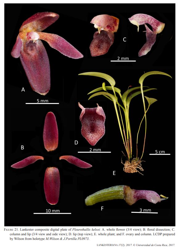Pleurothallis kelsoae Mark Wilson, B.T.Larsen & J.Portilla 2017 SECTION Ancipita Photo by Mark Wilson and A CLARIFICATION OF THE TAXONOMY OF PLEUROTHALLIS CROCODILICEPS (PLEUROTHALLIDINAE, ORCHIDACEAE) AND FOUR NEW SPECIES OF PLEUROTHALLIS IN SUBGENUS ANCIPITIA