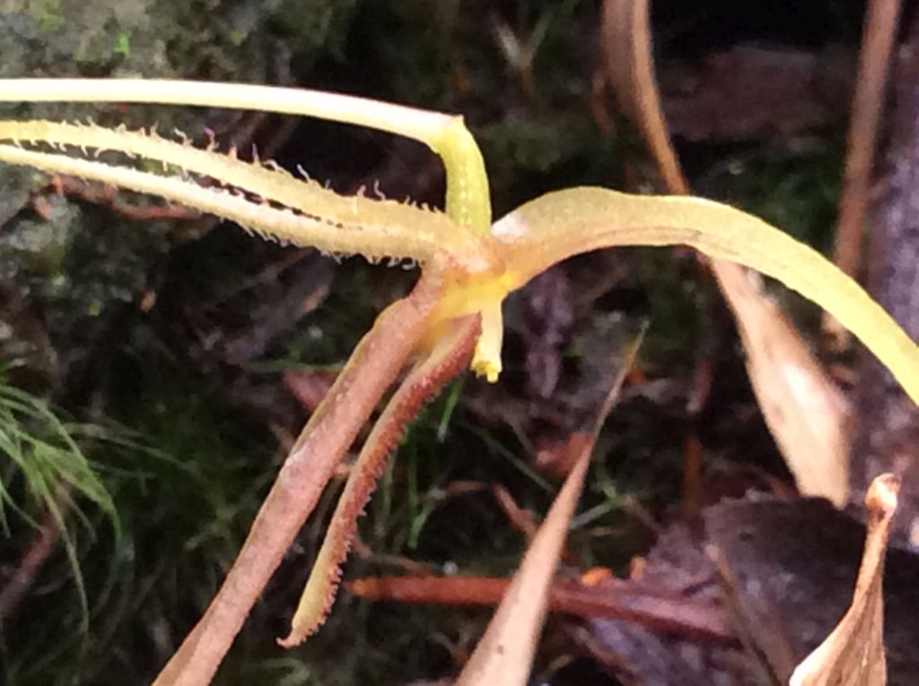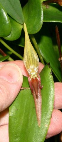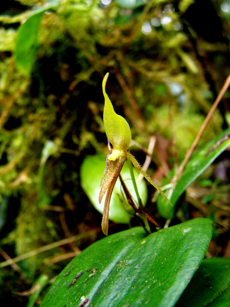 Recognized by the spreading, often prolific, ovate leaf with a resupinate flower held erect over the suface of the leaf by the pedicel arising from a reclining spathe and has very long, narrow, fimbriate petals and a narrowly ovate lip that is coarsely echinate.