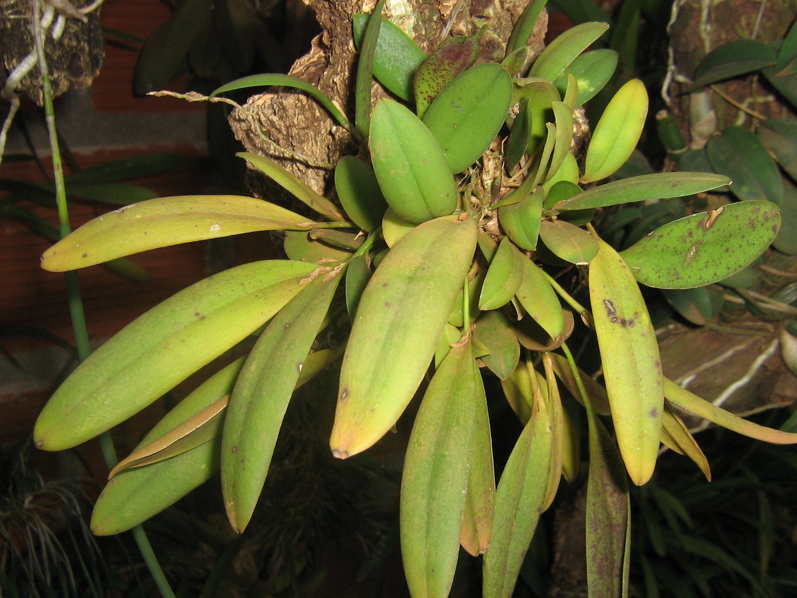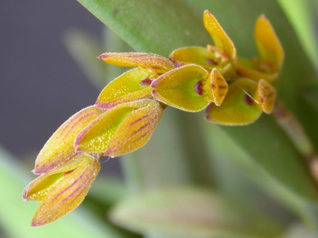 Found in southern and southeastern Brazil at elevations around 400 to 1300 meters as a mini-miniature sized, warm to cool growing epiphyte with erect, slender ramicauls enveloped by 3, loose, brown sheaths and carrying a single, apical, erect, coriaceous, elliptic, stiff, conduplicate, dark olive green leaf that blooms in the spring and summer on 1 to 2, 2 to 2.8" [5 to 7 cm] long, simultaneously 10 to 15 flowered inflorescence arising through a spathe at the apex of the ramicaul