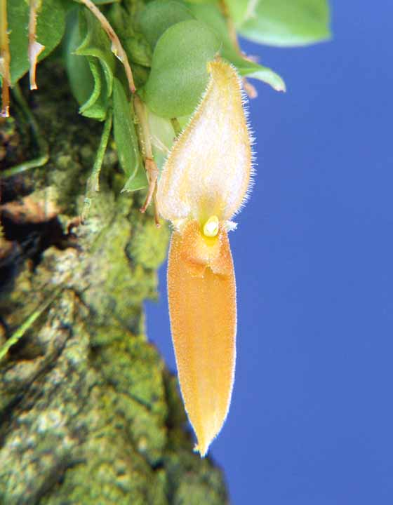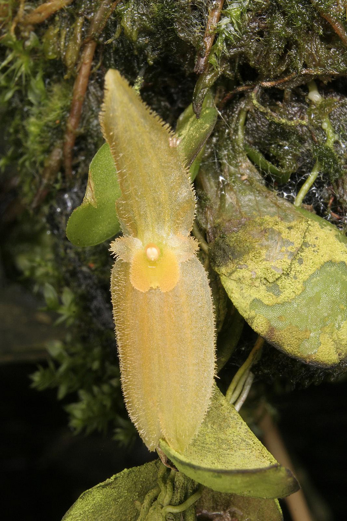 Found in Carchi Ecuador at elevations of 1200 to 1300 meters as a cool growing epiphyte with suberect ramicauls enveloped by 2 thin, loose, tubular sheaths and carrying single, apical, erect, thickly coriaceous, elliptical, subacute to obtuse, cuneate below into the petiolate base leaf that blooms in the later spring on a slender, .36 to .4" [9 to 10 mm] long, single flowered inflorescence with a thin, tubular floral bract.
