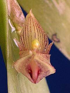 Found in Ecuador at elevations of 400 to 1500 meters as a miniature to just medium sized, hot to cool growing epiphyte with erect, stout, ramicaul enveloped basally by 2 to 3, thin, tubular, imbricating sheaths and carrying a single, apical, erect, coriaceous, rigid, ovate, acute to subacute, more or less convex, cuneate below into the rounded, sessile base leaf that blooms in the spring on a drooping, subdense, successively few flowered, 1.4" [3.5 cm] long, racemose inflorescence arising through a spathe at the apex of the ramicaul with loose, infundibulbar floral bracts and a shortly bristly ovary. I am fairly sure that the photo is not the correct species. I feel that it may be P phrynoglossa [See Icones Pleurothallidinarum XVI Pg 116a more recently described species from the same section]