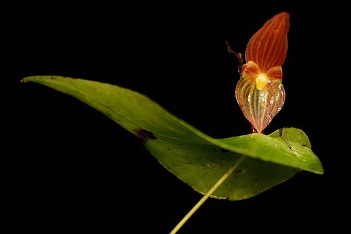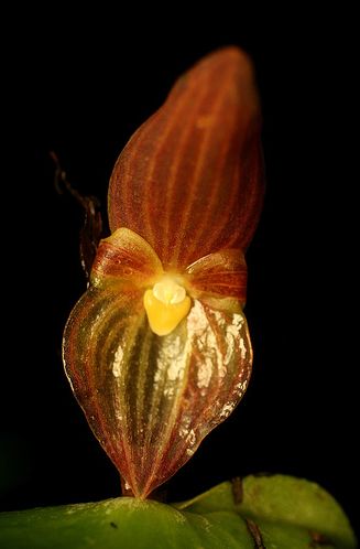 Found in Colombia at elevations around 800 to 1500 meters as a medium sized, warm to cool growing epiphyte with erect, slender ramicauls enveloped by a closely adpressed, tubular sheath below the middle and 2 to 3 others at the base and carrying a single, apical, spreading to deflexed, coriaceous, ovate, acute, sessile and deeply cordate base leaf that blooms in the spring and summer on fascile of successive single flowered inflorescence arising through an erect, foliaceous spathe with tubular floral bracts.