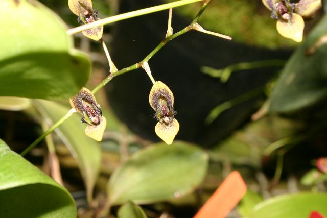 Found in Valle de Cauca Colombia without locality as a miniature sized, warm growing epiphyte with erect, stout ramicauls enveloped by a loose tubualr sheath and 2 shorter sheaths above the base and carrying a single, apical, erect, coriaceous, elliptical, obtuse, cuneate below into the sessile base leaf that blooms in the spring and summer on a loose, distichous, subflexuous, [5 to 11 cm] long, simutaneously several flowered inflorescence subtended by a spathe at the base of the leaf with an infundibular floral bract.