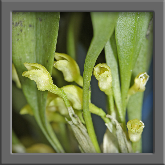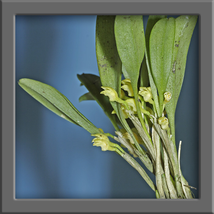 Found in Costa Rica at elevations around 2000 meters as a miniature sized cool to cold growing epiphyte with stout, ascending, terete ramicaul enveloped by 4 to 5 imbricating, tubular sheaths and carrying a single, apical, erect, coriaceous, elliptical, subacute to acute, cuneate below into the petiolate base leaf that blooms in the winter on a .15 to .20" [3 to 4 mm] long, fascile of successive, single flowered inflorescence arising from near the apex of the ramicaul with a tubular floral bract.