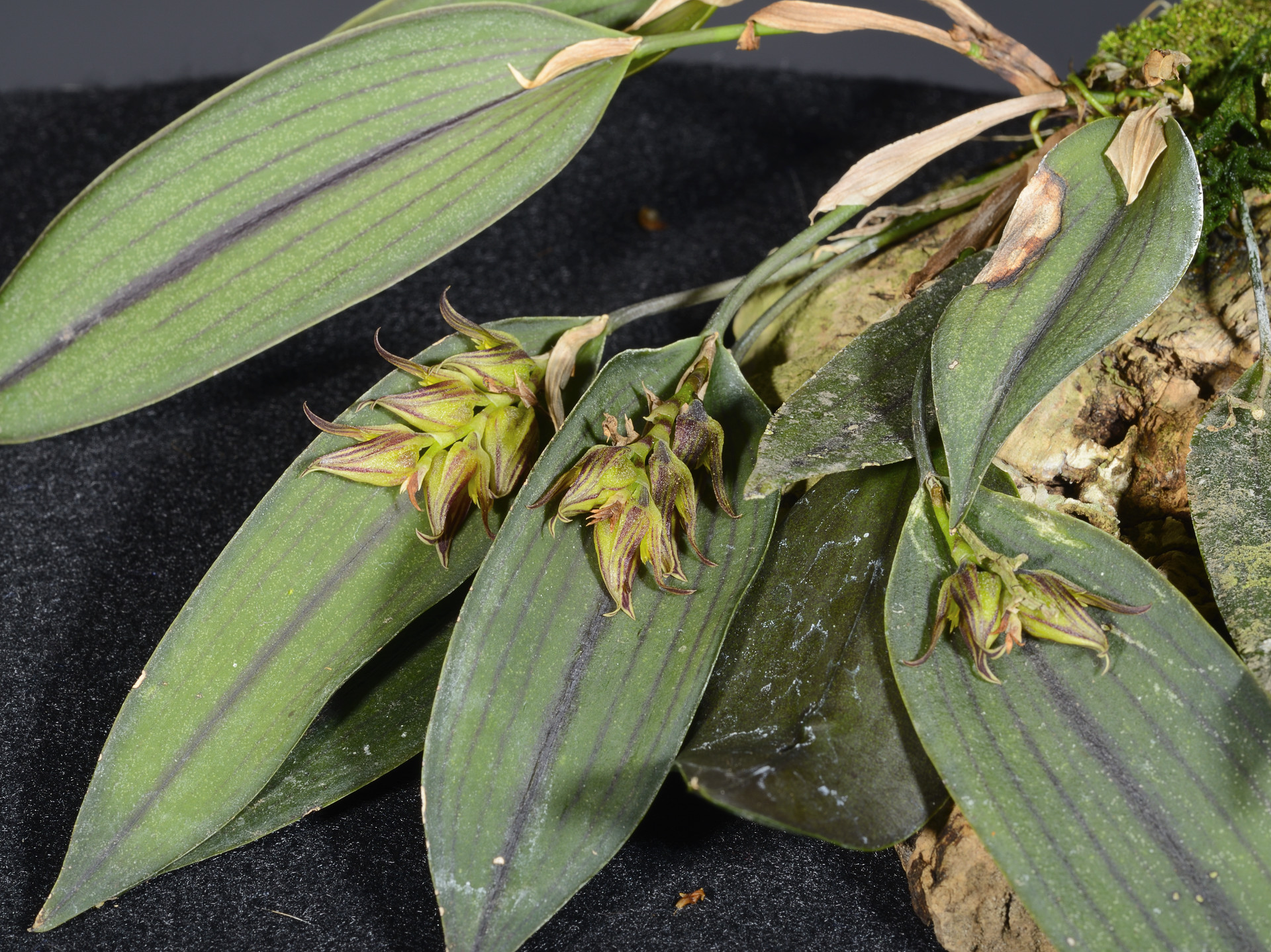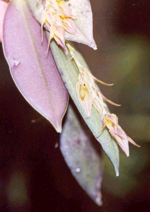 Found in Costa Rica and Panama at elevations of 1000 to 1300 meters as a small sized, warm to cool growing epiphyte with slender, pendent ramcauls enveloped by 3 inflated, tuublar sheaths and carrying a single, apical, erect, coriaceous, pendent, sharp margined, purple veined and suffused, elliptical, subacute, acuminate, rounded or cuneate below into the sessile base leaf that blooms in the fall and winter on a flaccid, pendent, disitichous, successively several flowered inflorescence.