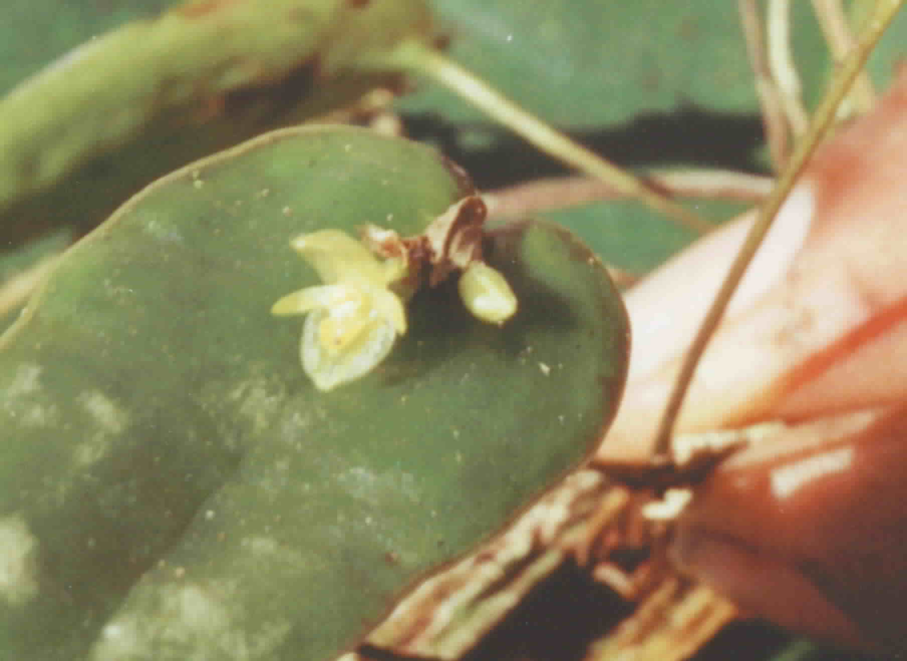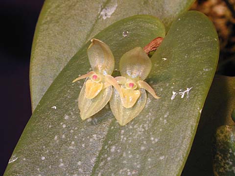 Found in Guatemala at elevations of 950 to 1350 meters as a mini-miniature to small sized, warm to cool growing epiphyte with slender, erect to suberect ramicauls with a close, tubular sheath on the lower half and another at the base and carrying a single, apical, suberect to horizontal, coriaceous, narrowly elliptical-ovate, acute, shallowly cordate below into the the sessile base leaf that blooms in the spring and again in the fall on a fascile of successively single, few flowered inflorescence arising and concealed by a spathe.