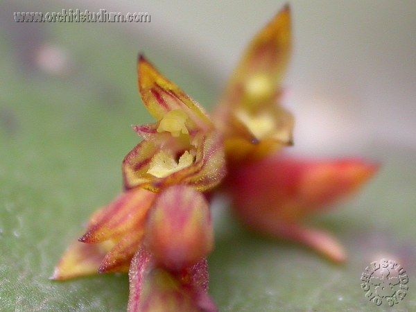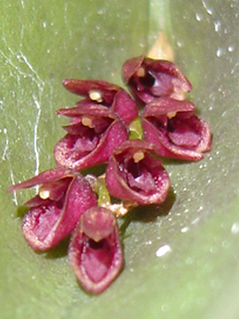 Found in southeastern Brazil in high mountain fields as a terrestrial underneath low shrubs among bracken and club mosses as a small to medium sized, cool growing terrestrial with a stout ramicaul carrying a single, apical, coriaceous, cordate acute, distinctly keeled, fleshy, light green to wine red depending on light intensity, abruptly narrowing into the petiolate base leaf that blooms at most any time of the year on a fasciculate, .6" [1.5 cm] long, successively single to 10 flowered inflorescence carrying alternate flowers.