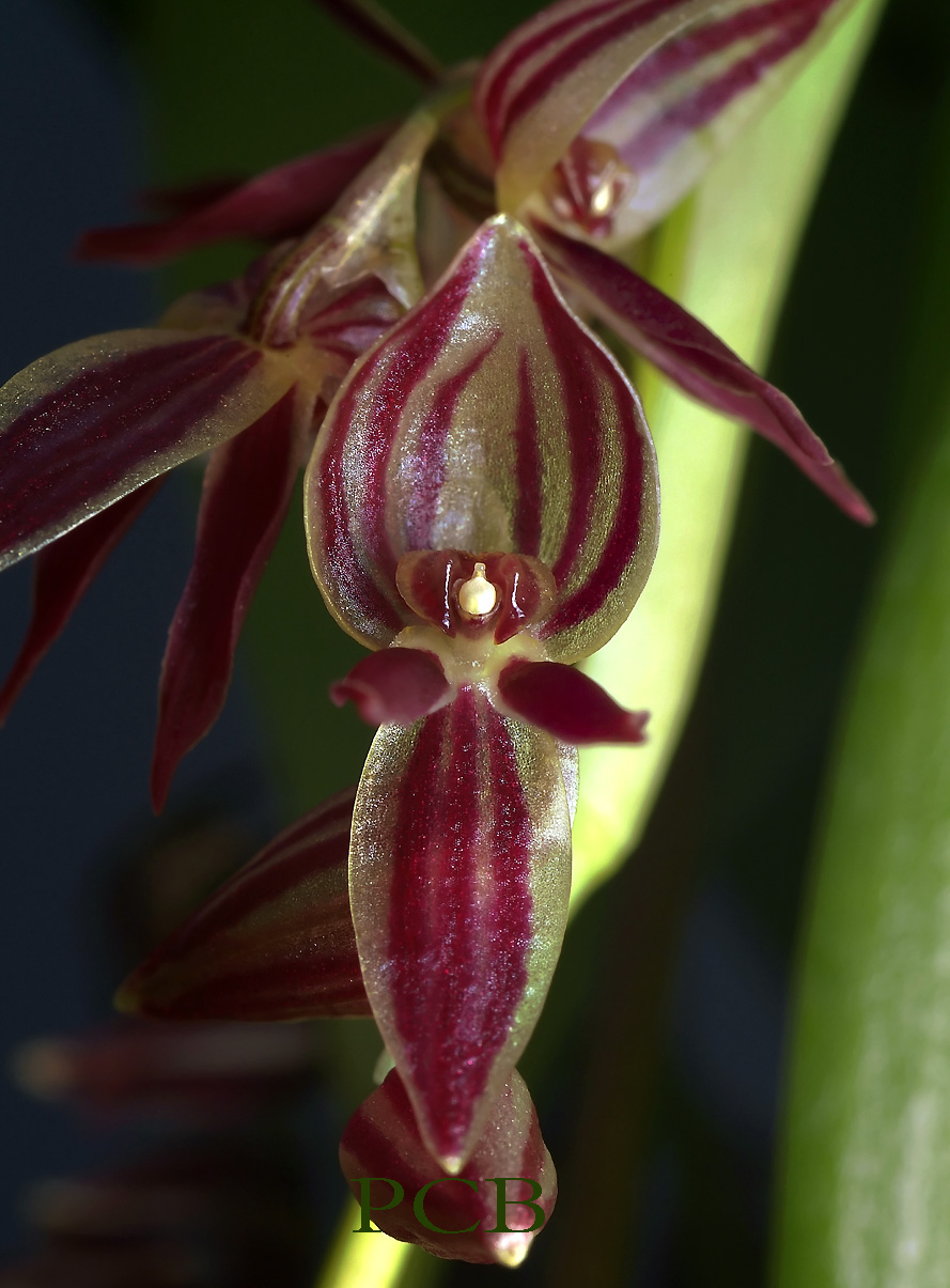 "Characterized by a slender to stout ramicaul carrying an acute, sessile leaf and one to a few, loosely flowered, arching racemes of purple striped flowers. From beneath the cucullate synsepal the elliptic petals protrude and diverge. The lip is cordate with the apex subacute to obtuse to entire. P bicornis which it is often confused is usually larger, the middle sepal is proportionally narrower, the pointed petasl ae in apposition or adherent and the apex of the lip is broadly rounded and variously fimbriate.
