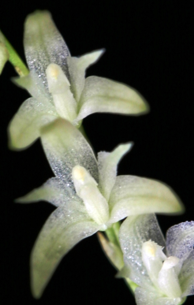 Found in Brazil and northern Argentina in humid rainforests at elevations of 900 to 1400 meters as a mini-miniature sized, warm to cool growing epiphyte with an erect ramicaul enveloped by 3 brown sheaths and carrying a single, apical, erect, linear-lanceolate, faintly conduplicate, infolded and finely attenuate into the base leaf that blooms in the earlier spring on an erect, [7 to 9 cm] long, simultaneously 9 to 12 flowered inflorescence