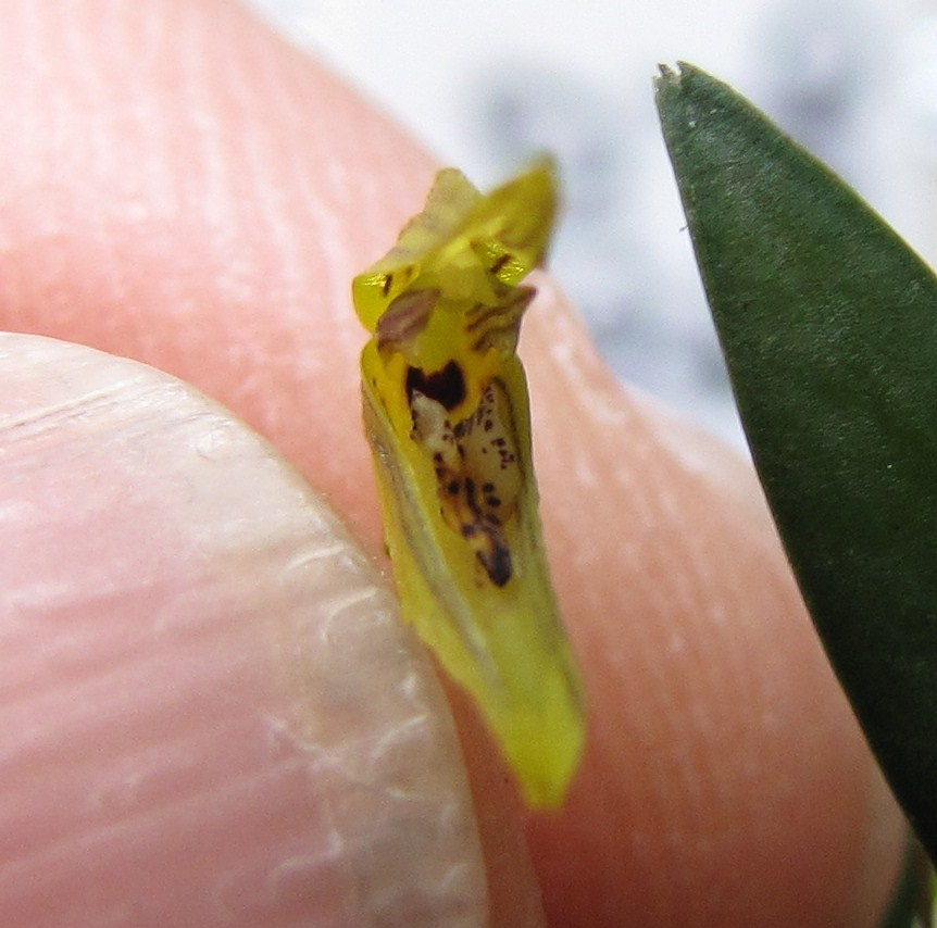 Found in Rio de Janiero State of Brazil at elevations of 300 to 700 meters as a mini-miniature to miniature sized, hot to warm growing epiphyte with an erect ramicaul enveloped by 3 tight, brown shaeth and carrying a single, apical, erect, dark green, linear-lanceolate, keeled, furrowed, finely attenuate to the base leaf that blooms in the summer through mid fall on a 1 to 2" 2.5 to 5 cm] long, successively single to 3 flowered inflorescence