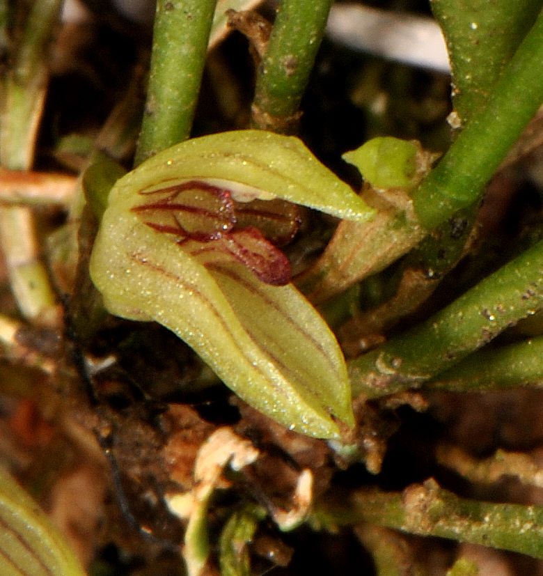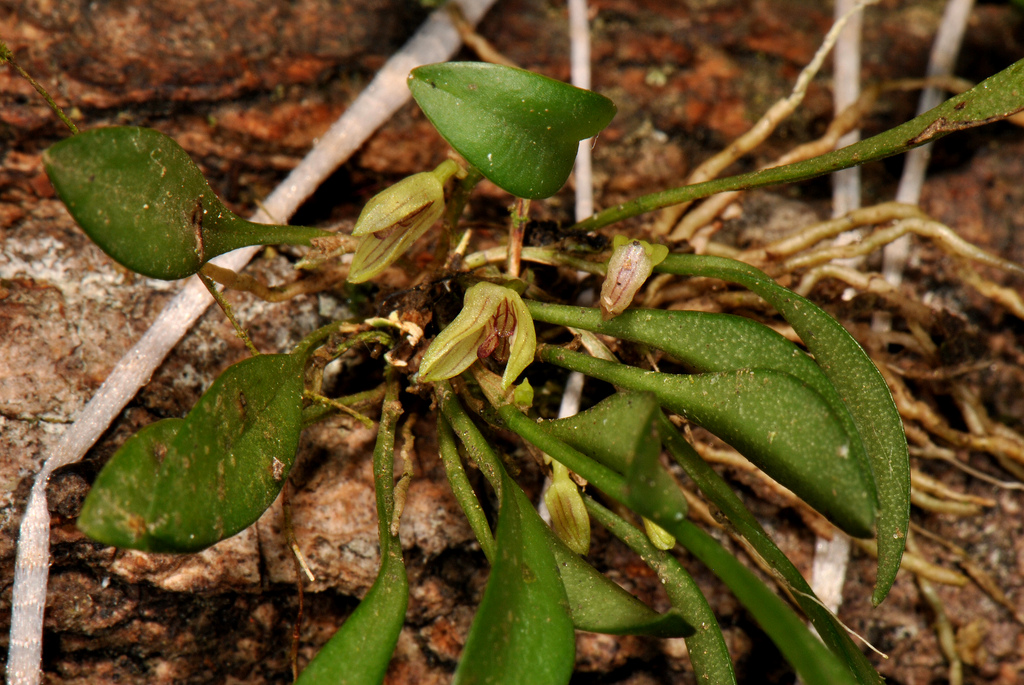 Found in eastern Brazil at elevations of 700 to 1200 meters as a mini-miniature sized, warm to cool growing epiphyte with slender, erect ramicauls enveloped by 3 tubular, membraneous sheaths and carrying a single, apical, linear-lanceolate, faintly conduplicate, light green attenuate into the base leaf that blooms in the spring through fall on a .12" to .2" [3 to 5 mm] long, single to 2 flowered inflorescence.