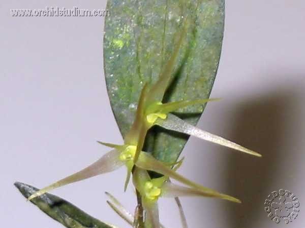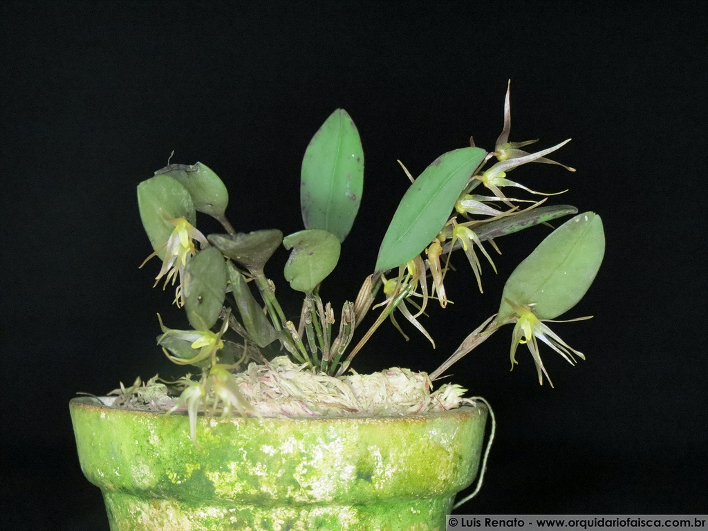 Found in eastern & southern Brazil in wet humid forests at elevations of 700 to 900 meters as a mini-miniature sized, warm growing epiphyte with erect ramicauls enveloped by 3 brown sheaths and carrying a single, apical, various shaped from lanceolate to elliptical, leathery, dark olive green to wine red, conduplicate and attenuate into the base leaf that blooms in the spring on 1 to 2, 2.4 to 3.2" [6 to 8 cm] long, mostly simultaneously to 8 flowered inflorescence and carrying fragrant flowers