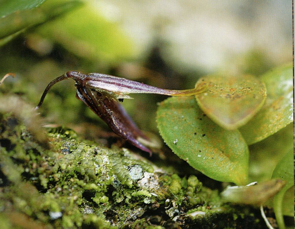 "Distinguished by the very small habit with proportionally large, purple-striped flowers. The little elliptical leaves are surpassed by a loose, successively few flowered inflorescnece. The tip of the narrow dorsal sepal is thickened and the laterals are acute. The petals are deeply lacerate. The oblong lip is also lacerate with erect lobes above the base. The cuneate base of the lip is narrowly concave and solidly united to the tip of the column foot. Luer 1998