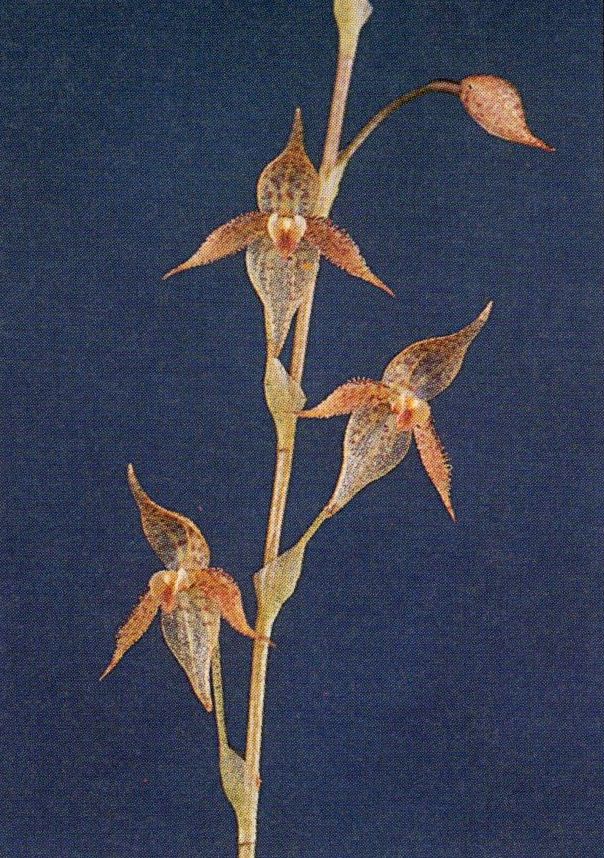 Found in Antioquia Colombia at elevations around 2600 meters as a medium sized, cool to cold growing epiphyte with stout erect ramicauls enveloped basally by a close fitting, tubular sheath above the base and another at the base and carrying a single, apical, erect, coriaceous, ovate, subacute, acuminate, sessile and deeply cordate base leaf that blooms in the spring on a loose, distichous, strict, 12 to 14" [30 to 35 cm] long, simultaneously many flowered inflorescence arising through a reclining spathe and has thin, tubular floral bracts.