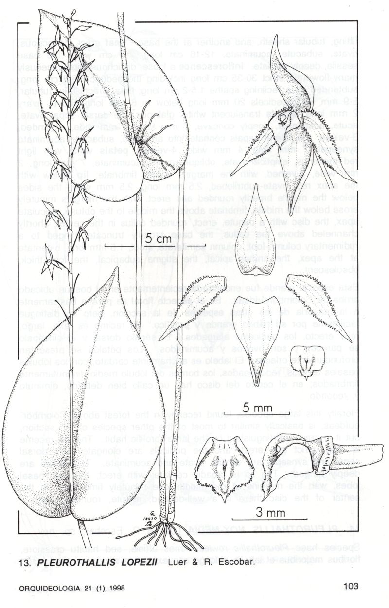 References W3 Tropicos, Kew Monocot list , IPNI ; *Orquideología Vol 21 #1 Luer & Escobar 1998 drawing/photo fide; Native Colombian Orchids Vol 6 COS 1998 photo fide; Icones Pleurothallidinarum Vol XVII Systematics of Pleurothallis Section Abortivae, Truncatae, Subsection Acroniae, Subgenera Dracontia and Uncifera Luer 1998 drawing fide; Icones Pleurothallidinarum Vol XXVII Luer 2005 as Acronia lopezii; Orquideas del Valle de Aburra Medellin Colombia Orqidelogia 2014 photo fide