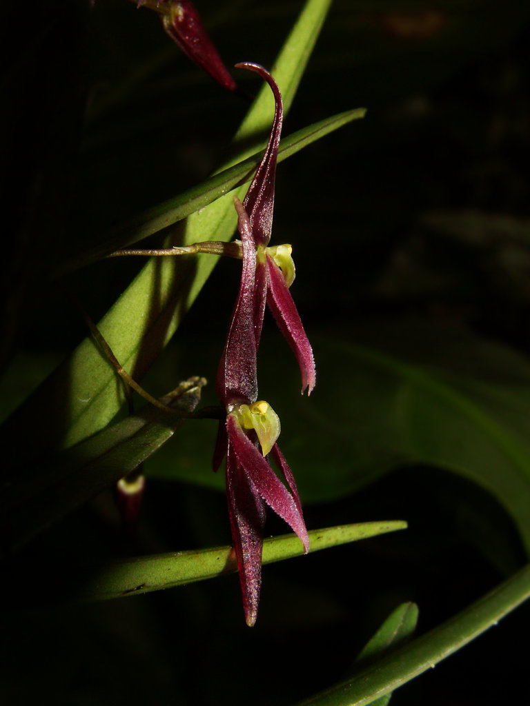 Found in Nicaragua, Costa Rica and Panama in very wet montane forests at elevations of 300 to 1150 meters as a miniature, hot to cool growing epiphyte with slender, erect, ramicauls enveloped basally by 2 to 3 basal, tubular sheaths and another below the middle carrying a single, apical, erect, coriaceous, narrowly elliptical-ovate, acute leaf that is narrowly cuneate and sessile basally that blooms in the spring on an erect to arching, loose, distichous, simultaneoulsy few to several flowered, 2 2/5" to 3 1/5" [6 to 8 cm] long, racemose inflorescence arising from a spathe and having thin, tubular floral bracts.