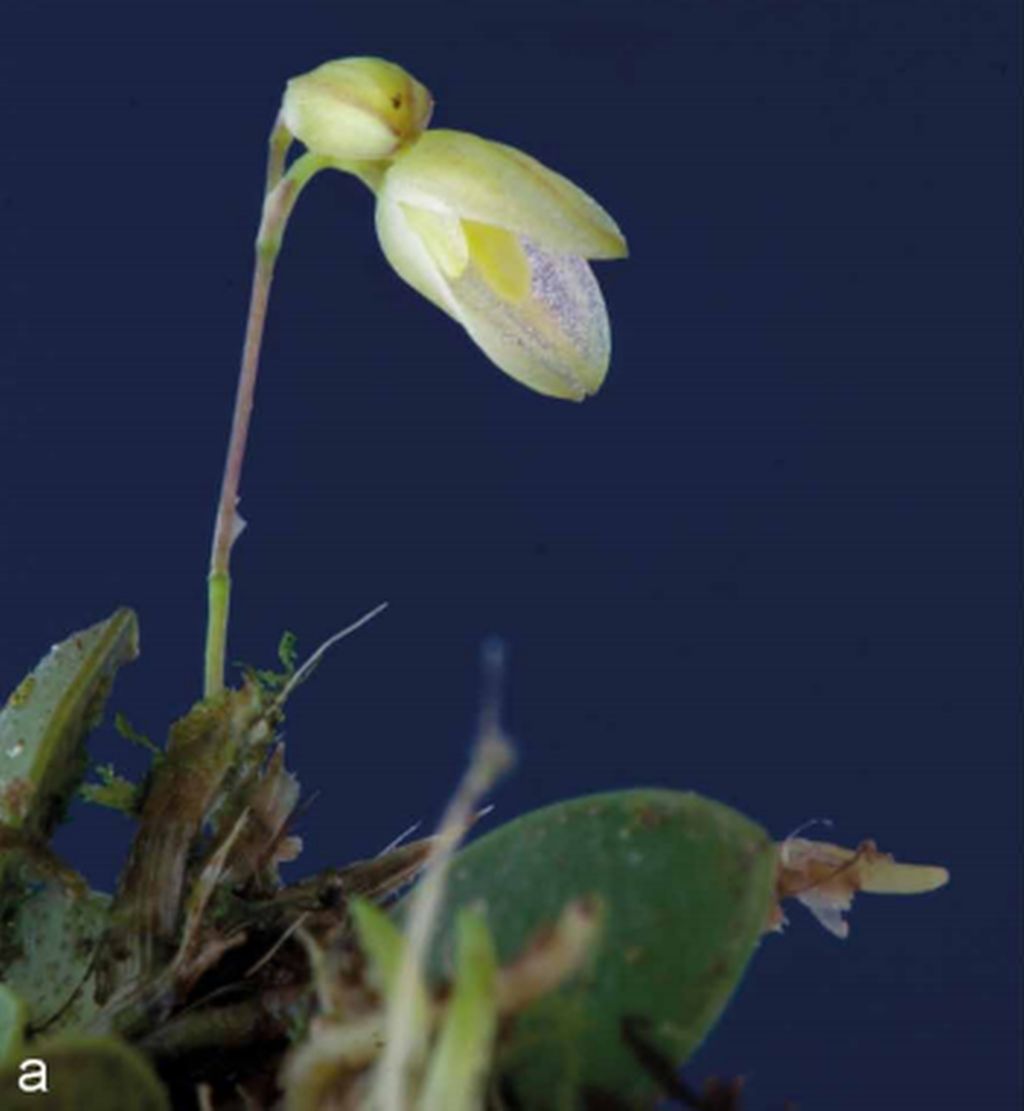 Found in Nicaragua and Costa Rica in tropical wet forests at elevation of 200 to 350 meters as a mini-miniature sized, hot growing, caespitose, prostrate to suberect epiphyte with short, terete, cylindrical ramicauls enveloped completely by papyraceous sheaths and carrying single, apical, suborbicular to broadly elliptic, densely spotted with purple abaxially leaves that blooms in the spring on a lateral, from the apex of the stem, without an annulus, erect, peduncle cylindric, to .6" [15 mm] long, flexuous, distichous, [.6 to .8" [15 to 20 mm] long overall, successively 1 to 2, to 6 flowered inflorescence with infundibuliform, broadly ovate, acute, half as long as the pedicel and ovary.