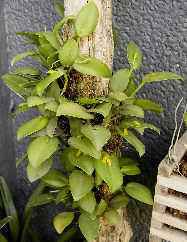 Found in Brazil, south and east of Minas Gerais in cloud forests along river banks at elevations of 1100 to 1400 meters as a miniature sized, caespitose, warm to cool growing epiphyte with an erect, stout ramicaul enveloped by 2 to 3 tubular sheaths and carrying a single, apical, narrowly-ovate-cordate, acute, abruptly narrowing below into the elongate, petiolate base leaf that blooms in the fall through winter on 1 to 2, short, .6" [1.5 cm] long, simultaneously 1 to 4 flowered inflorescence arising from the apex of the ramicaul. This can occur for years out of the same leaf.