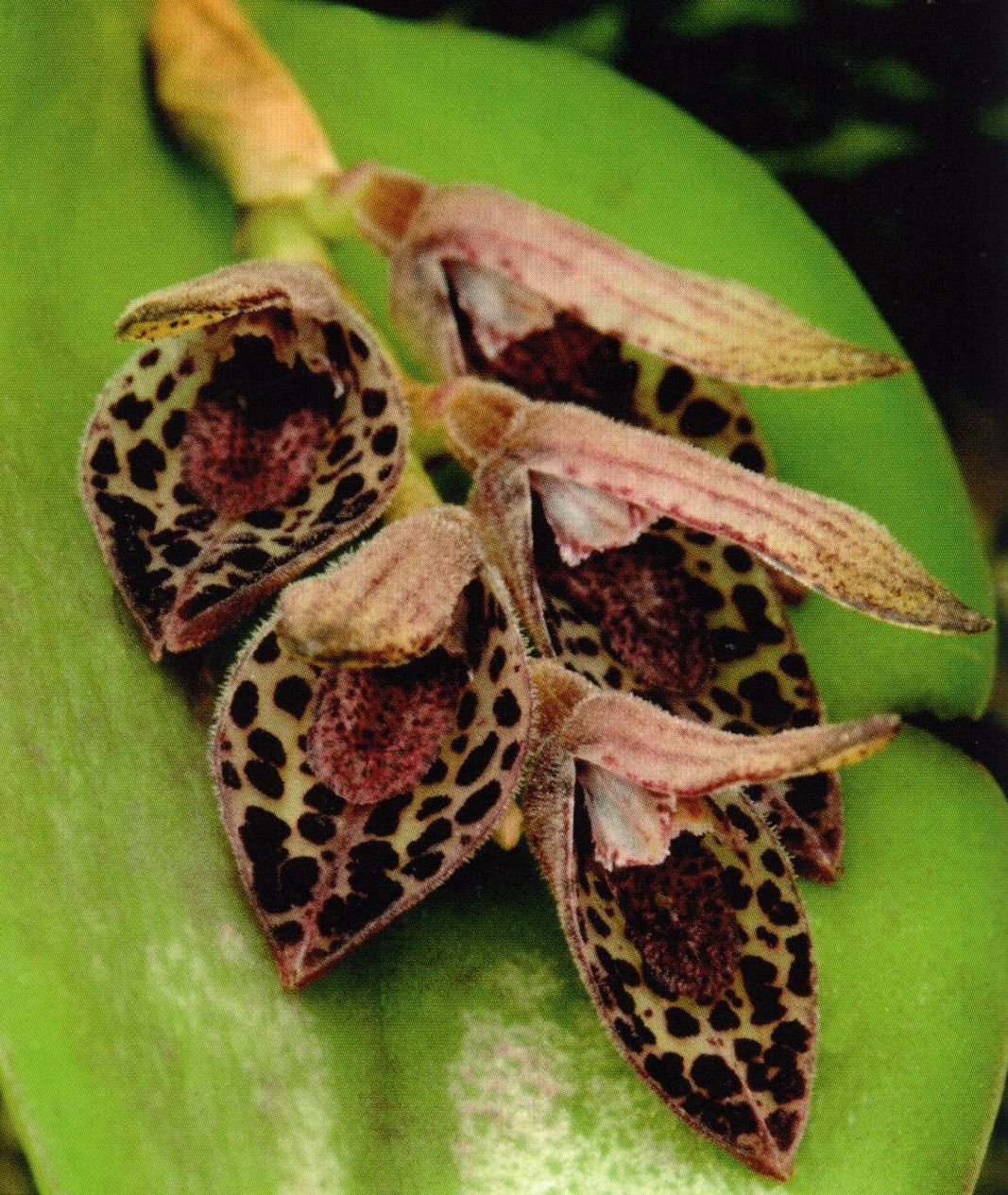 Found in the Oaxaca and Chiapas states of southeastern Mexico in seasonally very dry pine-oak forests at elevations around 1250 to 2200 meters as a mini-miniature sized, cool to cold growing epiphyte with erect, subterete-obconical, slightly dilated towards the apex ramicauls enveloped by 3, tubular infundibuliform sheaths and carrying a single, apical, erect, coriaceous, very fleshy, elliptical to ovate-elliptical, obtuse to rounded apically, conduplicate below into the sessile base leaf that blooms in the spring on 1 to 3, 1 per season, .43 to 2.2" [1.8 to 5.5 cm] long including the .4 to .8" [1 to 2 cm] long, slightly flexuous peduncle, 5 to 11 flowered inflorescence arising through a spathe at the base of the leaf and has a tubular floral bract.