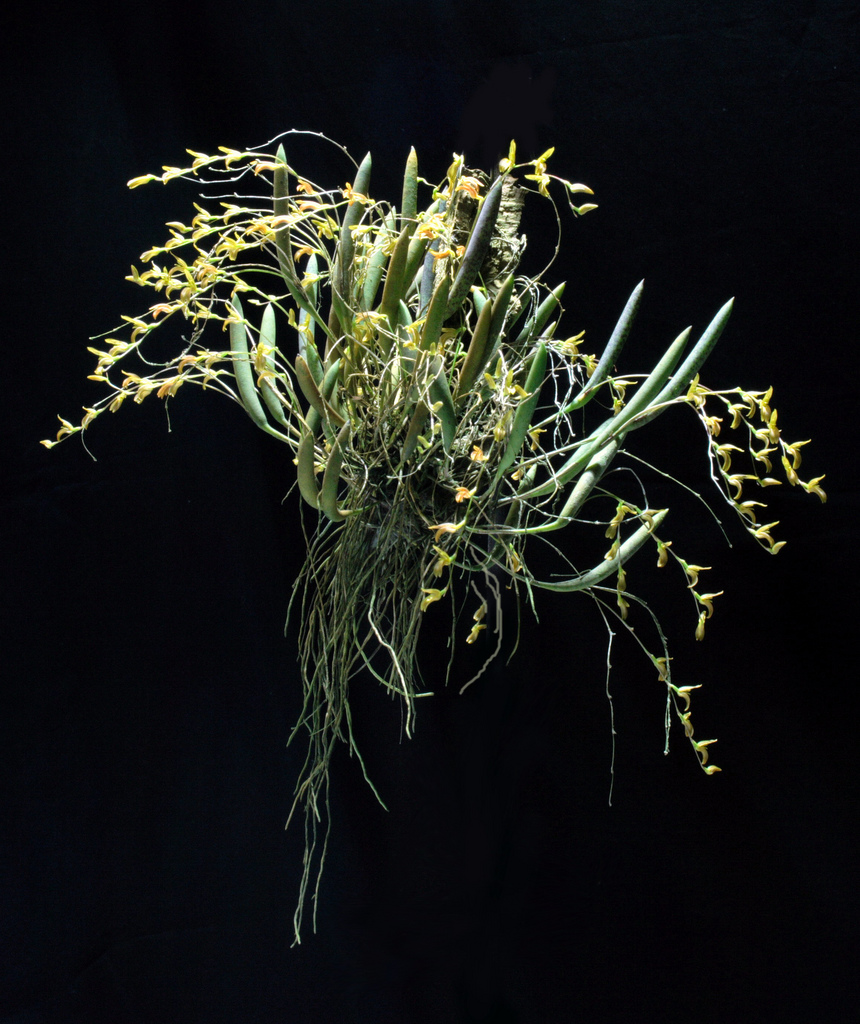 Found in Bolivia, Brazil and Argentina at elevations of 1700 to 1800 meters as a mini-miniature sized, warm to cool growing epiphyte with erect ramicauls carrying a single, terete, fleshy, linear leaf that blooms in the summer on an erect, 2" [5 cm] long, few flowered inflorescence