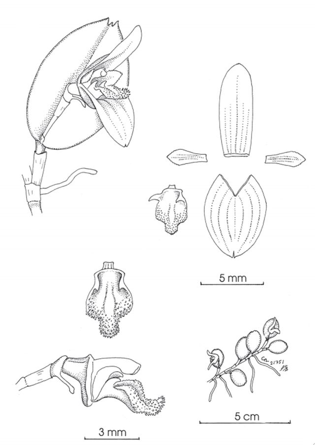 "This little species is distinguished by a coarse, long creeping, branching rhizome that bears a sessile, broadly elliptical, suberect, flat leaf with a prominent, tridentate apex. The single, short-stemmed flower is nearly as large as the leaf. Most remarkable is the coarsely verrucose, nearly black lip with a pair of uncinate lobes above the base." Luer & Toscano 2012