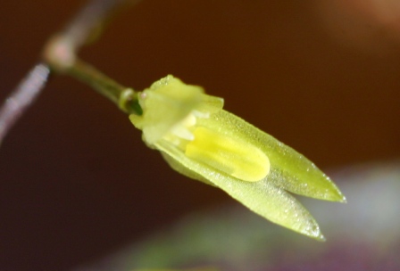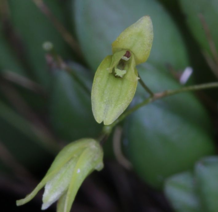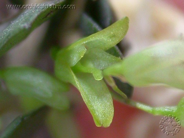 Found in southern Brazil on old trees mid way to high on trunk at elevations of 700 to 1300 meters as a mini-miniature sized, warm to cool growing epiphyte with an erect ramicaul enveloped basally by 2 to 3 trumpet shaped sheaths and carrying a single apical, erect, coriaceous, round to ovate, fleshy keeled leaf that blooms in the spring on a 1.4" [3.5 cm] long, successively 3, 5 to 7 flowered inflorescence.