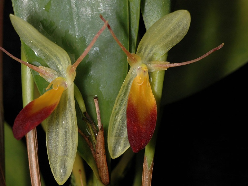 Found in Ecuador at elevations around 1000 to 1200 meters as a small sized, cool growing epiphyte with stout, erect ramicauls enveloped by a tubular sheath bewlow the middle and 1 to 2 shorter ones at the base and caryring a single, apical, erect, coriaceous, elliptical, obtuse, cuneate below into the sessile base leaf that blooms in the fall on a .2 to .24" [5 to 6 mm] long, successsively single, few flowered inflorescence arising and enveloped completely by a reclining spathe and a thin, tubular floral bract. .